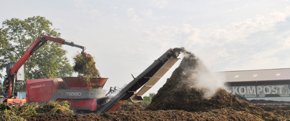 Nach 8 Wochen, 40 Mal Wenden und immer wieder Bewässern ist es endlich soweit. Der BIO-Jungkompost ist fertig. Durch den Verrottungsprozess ist eine homogener Kompost entstanden, der durch die Hitze frei von Unkrautsamen ist (Hygenisierung). Jetzt wird er mit einer Siebeanlage von größeren Stücken und Fremdteilen befreit (leider verwenden manche Leute ihre Biotonne als Mülltonne!!!). Die Fremdstoffe werden entsorgt, die verrottbaren größeren Stücke werden wieder als Kompostmiete aufgesetzt.
